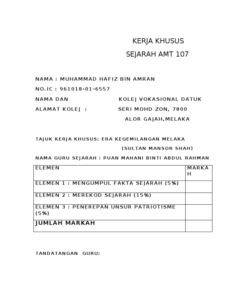 Baca versi flipbook dari KERJA KURSUS SEJARAH IFFAH FIRZANAH. Rumusan Kerja Kursus Sejarah Tingkatan 4 - Doc Contoh Kerja Kursus Pengajian Am. NAMA KELAS NAMA GURU.